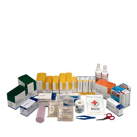 The 494-piece cabinet refill includes essential first aid supplies and over-the-counter medication for treating injuries or accidents that can occur in the workplace. The contents will refill a 3 shelf cabinet sufficient to support 100 people. Stay OSHA compliant at your light manufacturing facility, warehouse and light industrial site with this first aid cabinet refill.