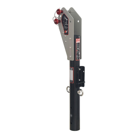 The KStrong® Lower Mast Assembly is engineered for compatibility with the Megadavit™ system, including configurations with H-base davit, wall/floor mounts, hitch mounts, and concrete flush mounts. It features a pre-installed mounting bracket compatible with retrieval blocks using a universal mounting bracket. The upper offset mast (BOOM) support plate is designed for easy attachment and adjustable positioning at three defined settings using locking pins. An additional eye nut is provided for rescue anchorage. The assembly includes a protective cap to prevent water and dust ingress.