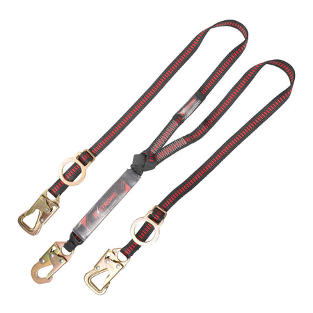 The KStrong® 6 ft. Twin Leg 100% Tie-Off Tie-Back Design Shock Absorbing Lanyard is engineered for maximum safety and reliability in demanding work environments. This double-leg lanyard is equipped with an energy absorber (PN 500) and features a steel snap hook (PN 146) at the attachment end, along with two tie-back hooks (PN 148) at the anchorage ends. It includes an adjustable D-ring for added versatility. Constructed from high-tenacity polyester webbing and alloy steel components, this lanyard is designed to withstand rigorous conditions and meets or exceeds ANSI Z359.13-2013 standards.