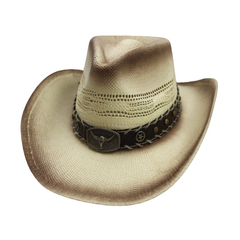 Introducing our Char Beige Cowboy Hat adorned with a bold Bull Emblem, meticulously crafted from 100% straw for superior durability and breathability. The hat's unique band, designed in Brown faux leather, features intricate detailing with medal studs and string wrap, adding a touch of Western charm. A striking medal emblem complements the front, while the light beige hue, accentuated with a light brown spray, gives this hat its distinctive appeal. Lightweight and cool, this hat stands out for its comfort and breathability, making it perfect for any occasion, from special events to everyday wear, providing shade from the sun's rays. With its strong and durable construction, coupled with an inner elastic band for a comfortable fit, our Char Beige Cowboy Hat is a must-have accessory for both style and functionality.