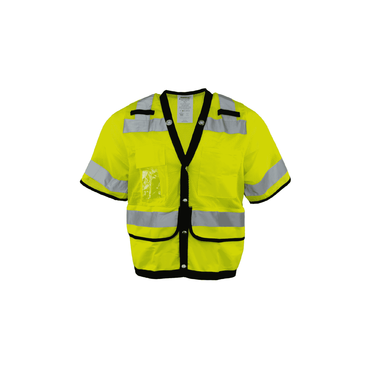 This high-visibility short sleeve safety vest is designed for maximum visibility and functionality. Made from lime polyester mesh fabric with black polyester binding, it meets Class 3 ANSI/ISEA 107-2015 safety standards. The 2” silver reflective tape enhances visibility, while the snap front and side closure ensures a secure and comfortable fit. Additional features include 2 radio clip holders, a clear ID holder, and 12 pockets, including a back tablet pass-through pocket for added convenience. Grommet holes provide attachment points for tools or accessories, making this vest an excellent choice for high-risk work environments.