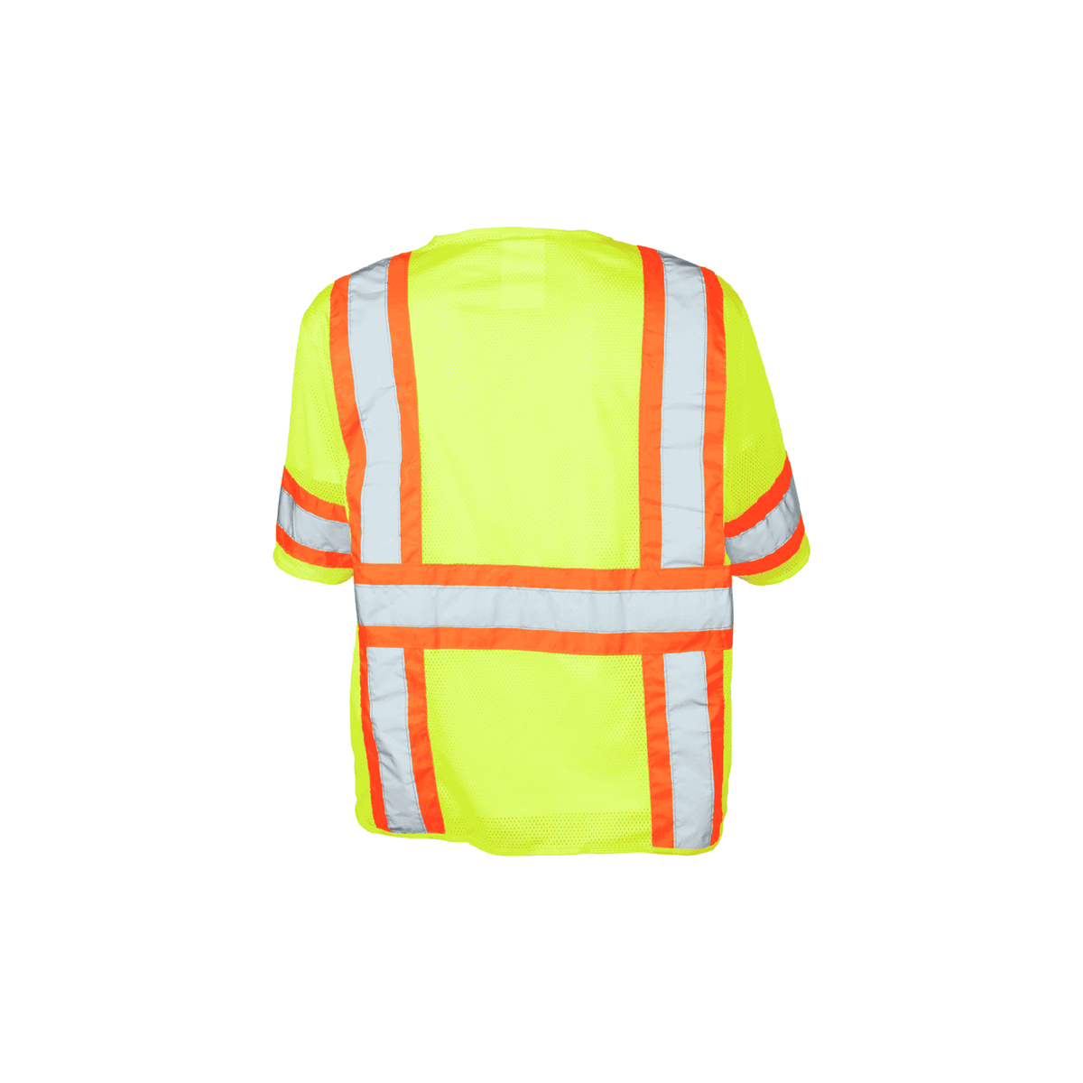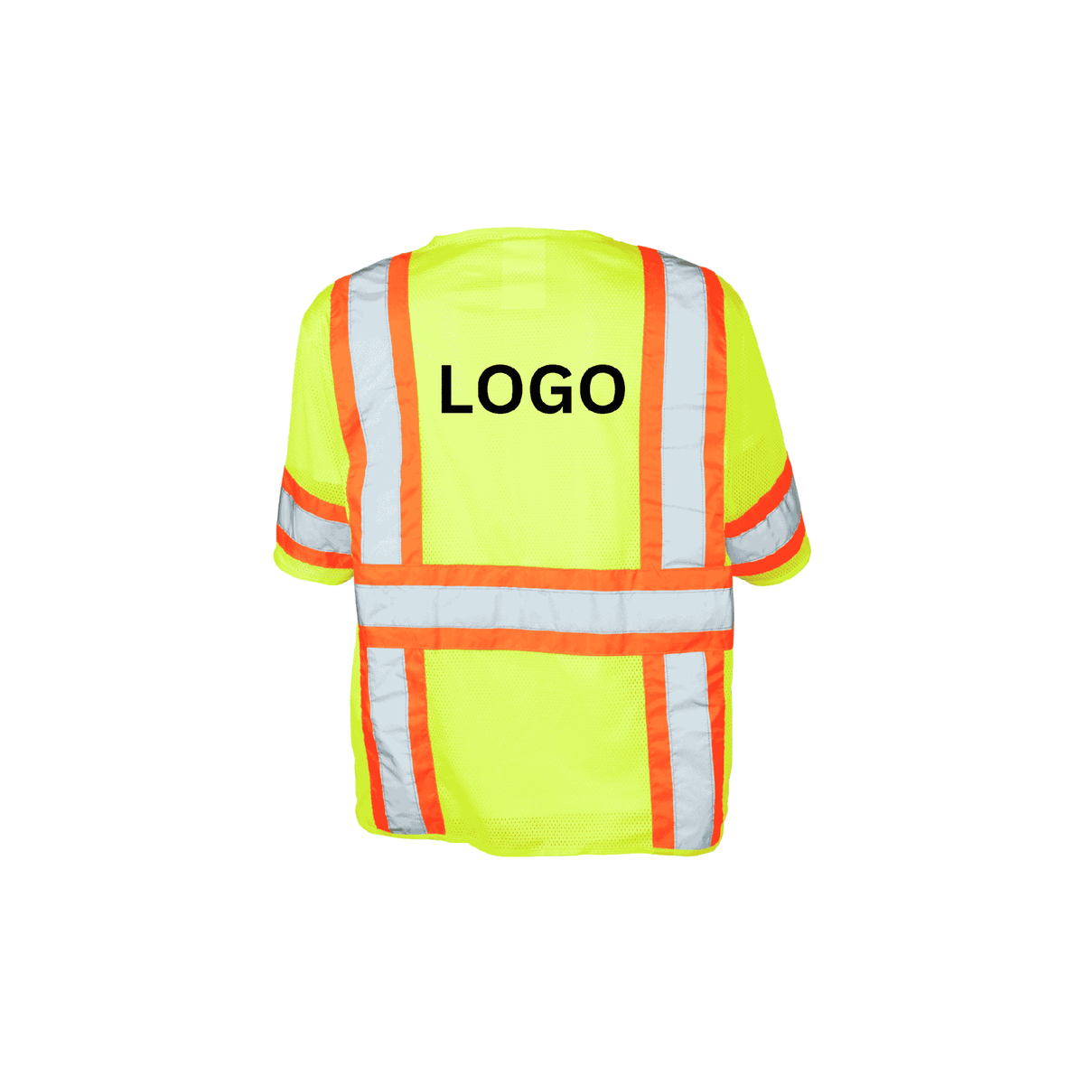 Enhance your work safety with our ANSI/ISEA 107-compliant hi-vis lime safety vest, meticulously designed for maximum visibility and superior functionality. Constructed from 100% polyester mesh fabric, this vest features hi-vis lime polyester binding and an eye-catching design element: 2” silver reflective tape applied over 4” hi-vis orange fabric. This distinctive reflective detailing extends over the shoulders, wraps around the torso, and forms a bold H-pattern across the back, ensuring comprehensive visibility from all angles. Designed for practical use, the vest also includes a secure zipper front closure, two dedicated radio clip holders for convenient hands-free communication, and six strategically positioned pockets—including two flap pockets at the waist, two inside pockets, and two chest pockets—to keep your essential tools within easy reach.