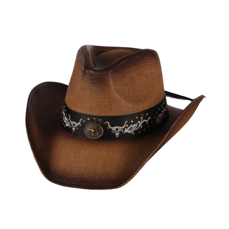 Introducing the Dusty Meadows Bull Cowboy Hat, a stunning blend of Southwestern charm and practicality, meticulously crafted from 100% woven natural straw. Its standout feature is the eye-catching Southwestern longhorn design adorning the hat band and the underside of the brim, adding a touch of rugged authenticity and making a bold statement wherever you go. Not only does this hat exude style, but it also serves as an ideal sunshade, keeping you cool and protected during your outdoor adventures. So whether you're roaming the open range or simply strolling through dusty meadows, this unique cowboy hat is sure to turn heads and elevate your look with its playful yet functional design