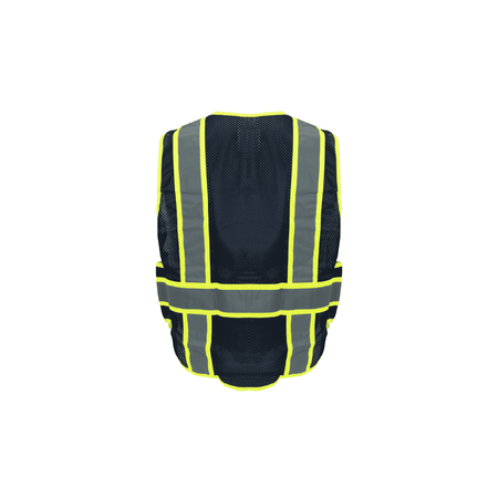 High-visibility economy safety vest made from breathable blue polyester mesh fabric with lime polyester binding. Features 2.5” silver reflective tape over 4” lime fabric for enhanced visibility. Designed with an adjustable wraparound hook & loop closure for a secure fit.
