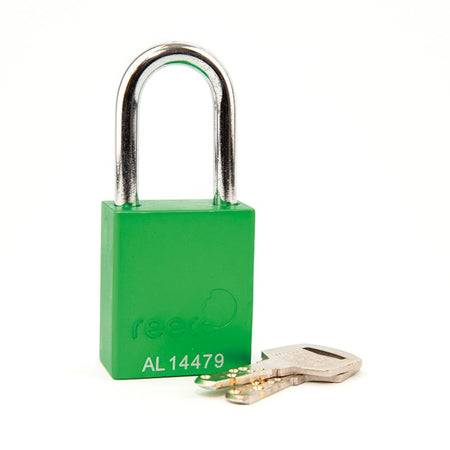 Reece's Green Aluminum Safety Padlock provide advanced safety for controlling hazardous energy. Engraved Lock Numbers on both the padlock and keys simplify safety protocols, facilitating key tracking made easy. The High-Safety Key Cylinder, offering over 120,000 combinations, ensures unparalleled worker protection with dimple key eliminating risk of duplication. The lightweight, Corrosion-Resistant Aluminum Body, measuring 1 1/2" x 1 3/4" with a 1 1/2" steel shackle, prioritizes safety without compromise. Key Retaining Design prevents accidental key removal, adding an extra layer of protection. Choose from nine bright Anodized Colors for clear identification.