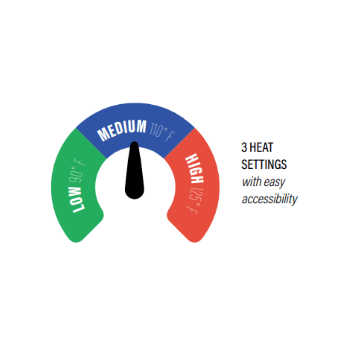 Three heat levels: Low (90°F), Medium (110°F), High (125°F)