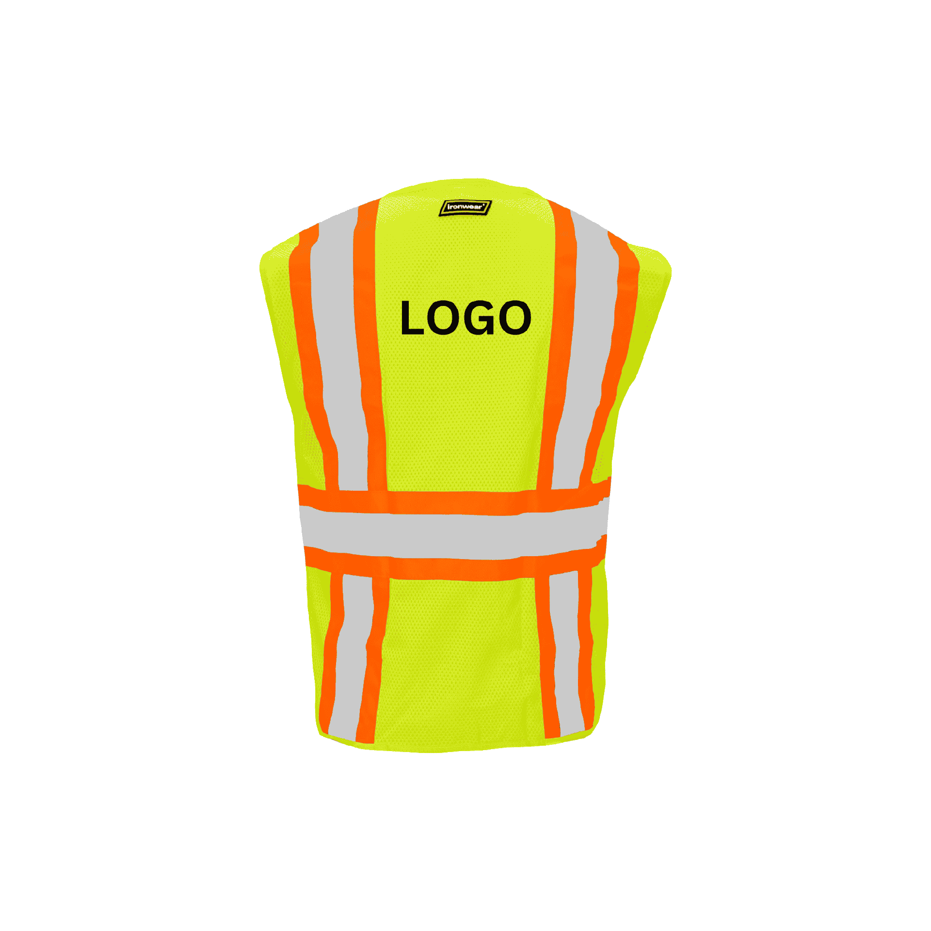 This high-visibility safety vest is available in lime or orange polyester mesh fabric with matching binding, enhancing visibility and safety. Compliant with Class 2, ANSI / ISEA 107-2015 standards, the vest features 2" silver reflective tape on contrasting 4" orange or lime fabric for a two-tone effect. The vest includes a zipper front closure, two radio clip holders, and six pockets: two inside upper chest pockets, two outside upper chest pockets, and two outside lower pockets with flaps.