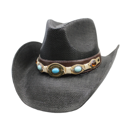 Crafted from a distinctive braided natural straw material, this hat boasts intricate rope detailing adorned with turquoise beads for a touch of Southwestern flair. Offering both coolness and breathability, it also includes an interior moisture-wicking sweatband, ensuring dryness and comfort during sunny outings. Continuously redefining style and fashion standards, this Round Up Cowboy Hat exemplifies their commitment to innovation and quality craftsmanship.