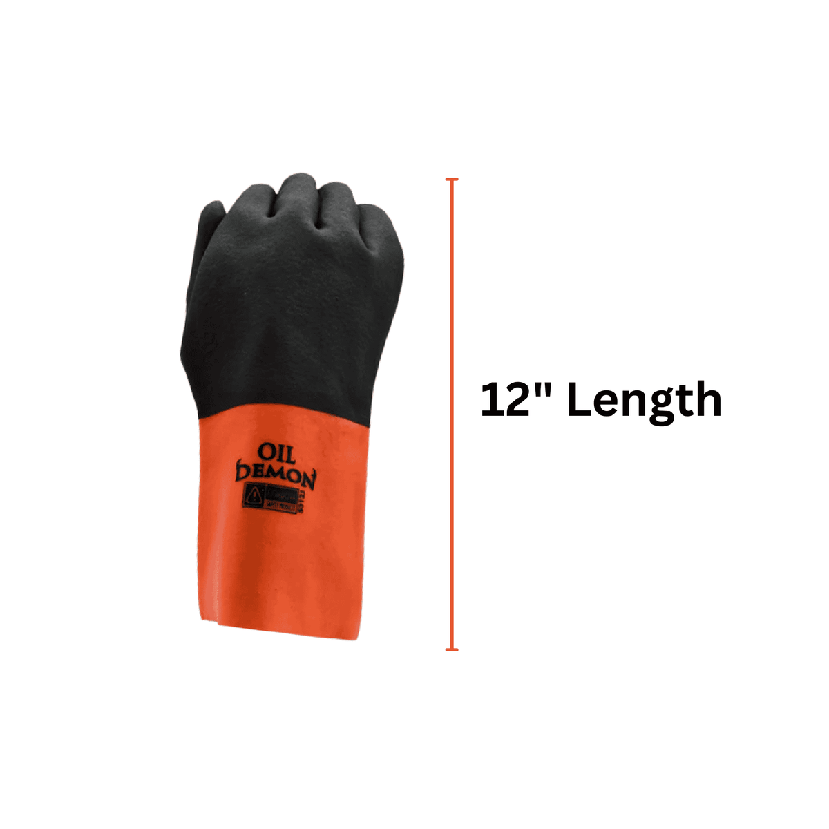 Tackle slick, hazardous tasks with confidence using the Oil Demon™ gloves from Cordova Safety Products. Engineered for oily and industrial environments, these gloves feature a double-dipped black and orange PVC coating for enhanced durability and chemical resistance. The sandpaper-style finish delivers excellent grip, even when working with oil-coated tools or greasy surfaces. Measuring 12 inches in length, they offer extended protection past the wrist for added safety on the job.