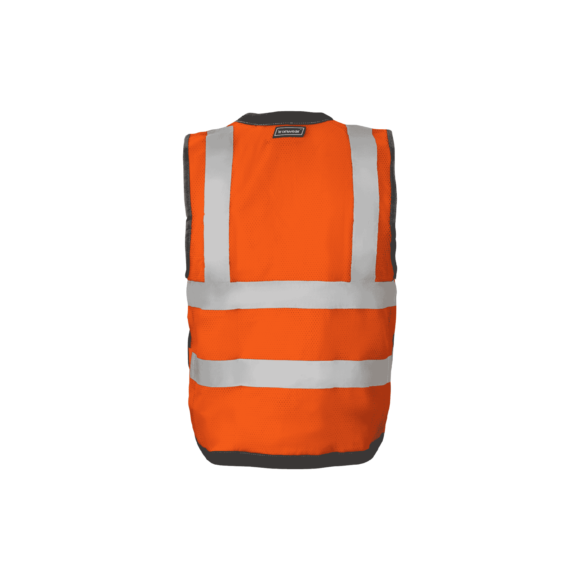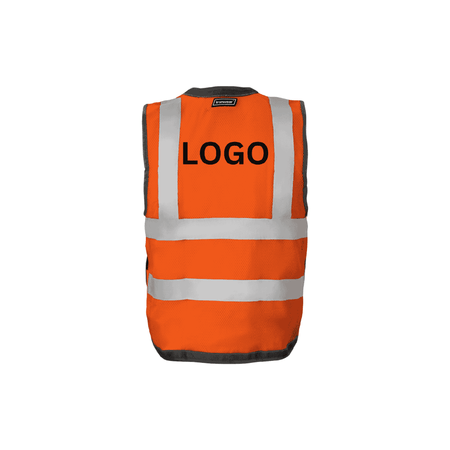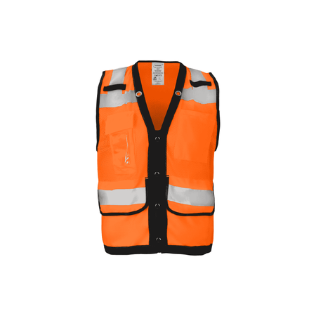 This high visibility vest is crafted from orange polyester mesh fabric paired with black polyester binding, ensuring both durability and standout visibility. Rated as Class 2 and compliant with ANSI/ISEA 107-2015 standards, the vest features 2-inch silver reflective tape to enhance safety in low-light conditions. It is designed with snap closures on the front and side for a secure, comfortable fit, and includes 2 grommet holes for additional accessory attachment. The vest offers practical storage with 8 well-placed pockets, including an inside chest pocket, lower inside and outside pockets (with flaps on the outside), dedicated chest pockets with pen holders, and a back tablet pass-through pocket, making it ideal for professionals who need both safety and functionality.