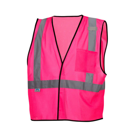 Designed for all-day comfort, this pink safety vest is constructed from 120 GSM 100% polyester mesh material that allows for maximum breathability. It features 2" silver reflective striping applied horizontally around the lower chest and vertically over the shoulders and back to provide visibility from multiple angles. The vest is equipped with a secure hook and loop front closure for easy wear and an integrated mic tab for convenient communication access. Customers should buy this safety vest because it provides a reliable, lightweight fit that can be easily maintained through standard machine washing for up to 25 washes.