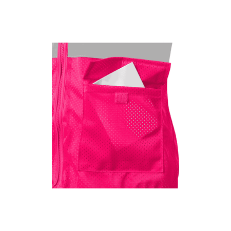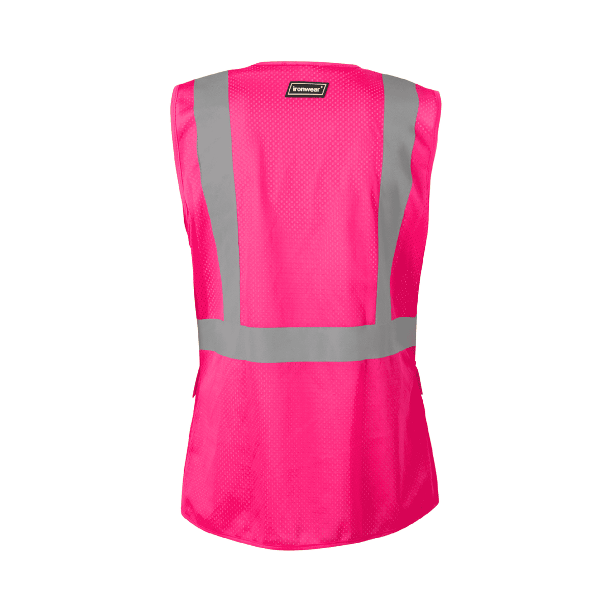This women's high-visibility safety vest is designed for both style and functionality, ensuring safety while maintaining a comfortable fit. Made from 100% polyester mesh fabric in a vibrant pink color, it is lightweight and breathable for all-day wear. The vest features 2-inch silver reflective tape that extends over the shoulders and around the torso, enhancing visibility in low-light conditions.