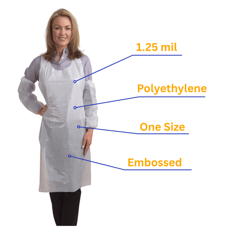 This white, 1.25 mil polyethylene apron is embossed and die cut. One size fits most.