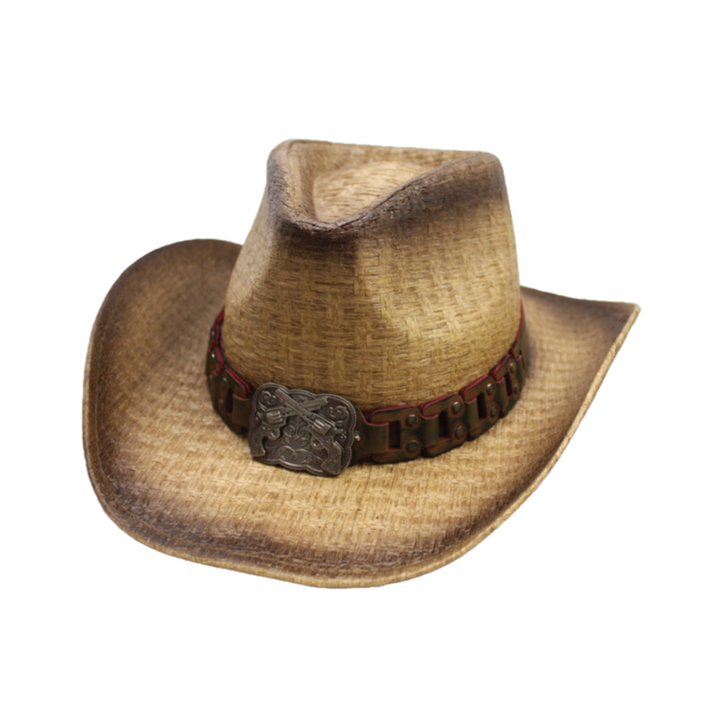 Step into the wild west with our rugged yet refined western style hat, designed to give you that industrial, edgy allure you crave. Crafted from 100% straw, this hat boasts a distinctive tea stain color, evoking visions of dusty desert trails and sun-soaked adventures.