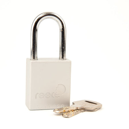Reece's Silver Aluminum Safety Padlock provide advanced safety for controlling hazardous energy. Engraved Lock Numbers on both the padlock and keys simplify safety protocols, facilitating key tracking made easy. The High-Safety Key Cylinder, offering over 120,000 combinations, ensures unparalleled worker protection with dimple key eliminating risk of duplication. The lightweight, Corrosion-Resistant Aluminum Body, measuring 1 1/2" x 1 3/4" with a 1 1/2" steel shackle, prioritizes safety without compromise. Key Retaining Design prevents accidental key removal, adding an extra layer of protection. Choose from nine bright Anodized Colors for clear identification, with Customizable Engraving also available.