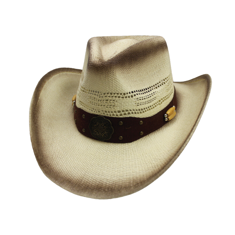 Elevate your Western look with our Singed Western Cowboy Hat featuring a unique designed band. Crafted from durable straw, this hat boasts a distinct flower-designed emblem and intricate beaded sides for added flair. The brown tooled leather band and under brim overlay not only enhance its aesthetic appeal but also add a touch of sophistication to your ensemble. Whether you're out on the ranch or hitting the town, this stylish cowboy hat is the perfect accessory to complete your Western-inspired outfit