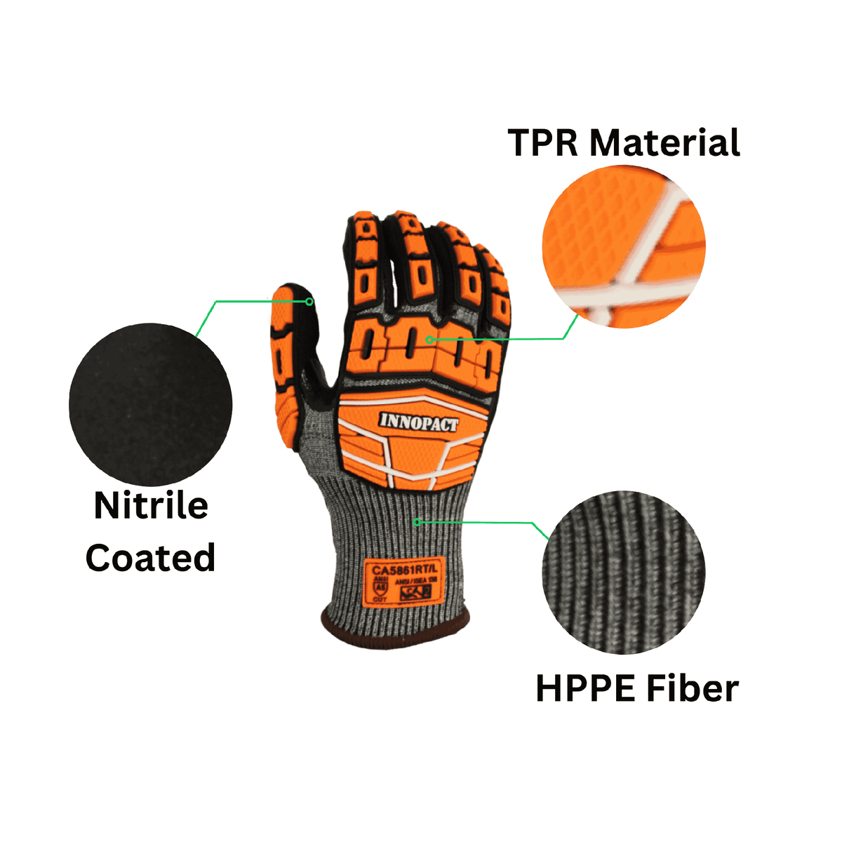 - Material: High-Performance Polyethylene (HPPE) fiber shell combined with a nitrile-coated palm and fingers.