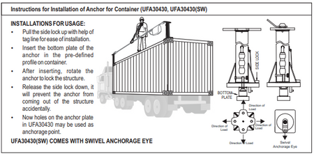| Design | Provides temporary anchor for 20 ft. – 40 ft. shipping containers. Can be used as a stand-alone anchor or to form a horizontal lifeline. Side lock and tagline for easy, secure installation by one person. Four holes on anchor plate for connections. Side handle with special grip for easy carrying and transportation. Easily removable without damaging the container |
