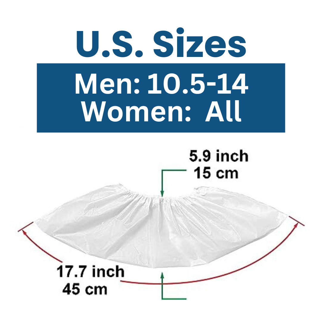 Discover our high-quality waterproof CPE plastic shoe covers, expertly designed for unparalleled protection and durability. Crafted with 100% waterproof material, these covers form a dependable shield against moisture, germs, dirt, and dust, ensuring a pristine and safe environment. The robust CPE material guarantees lasting use, while the double-banded elastics deliver a secure and snug fit over both boots and shoes. Embossed with slip-resistant patterns, these shoe covers provide exceptional traction on various ground surfaces. With hassle-free on and off application, they are perfect for wearing over recommended shoe sizes, accommodating men's size 14 US and all women's US sizes. Stay confident and safeguarded in any setting with our top-notch waterproof shoe covers.